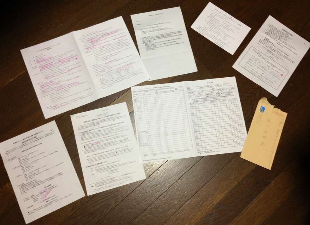 さぁ、これら5種類の提出用紙を漏れなく抜けなく書いたらば、期限に間に合うよう郵送します